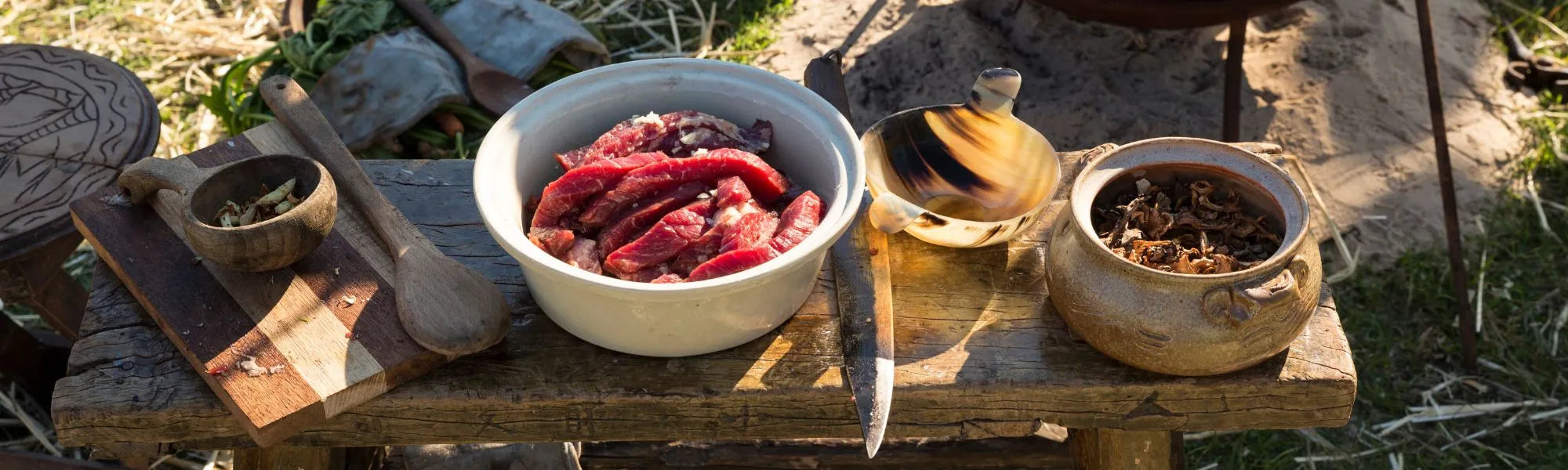 - Utensilios de preparación: cuchillos, tablas de cortar y morteros que recrean técnicas históricas.