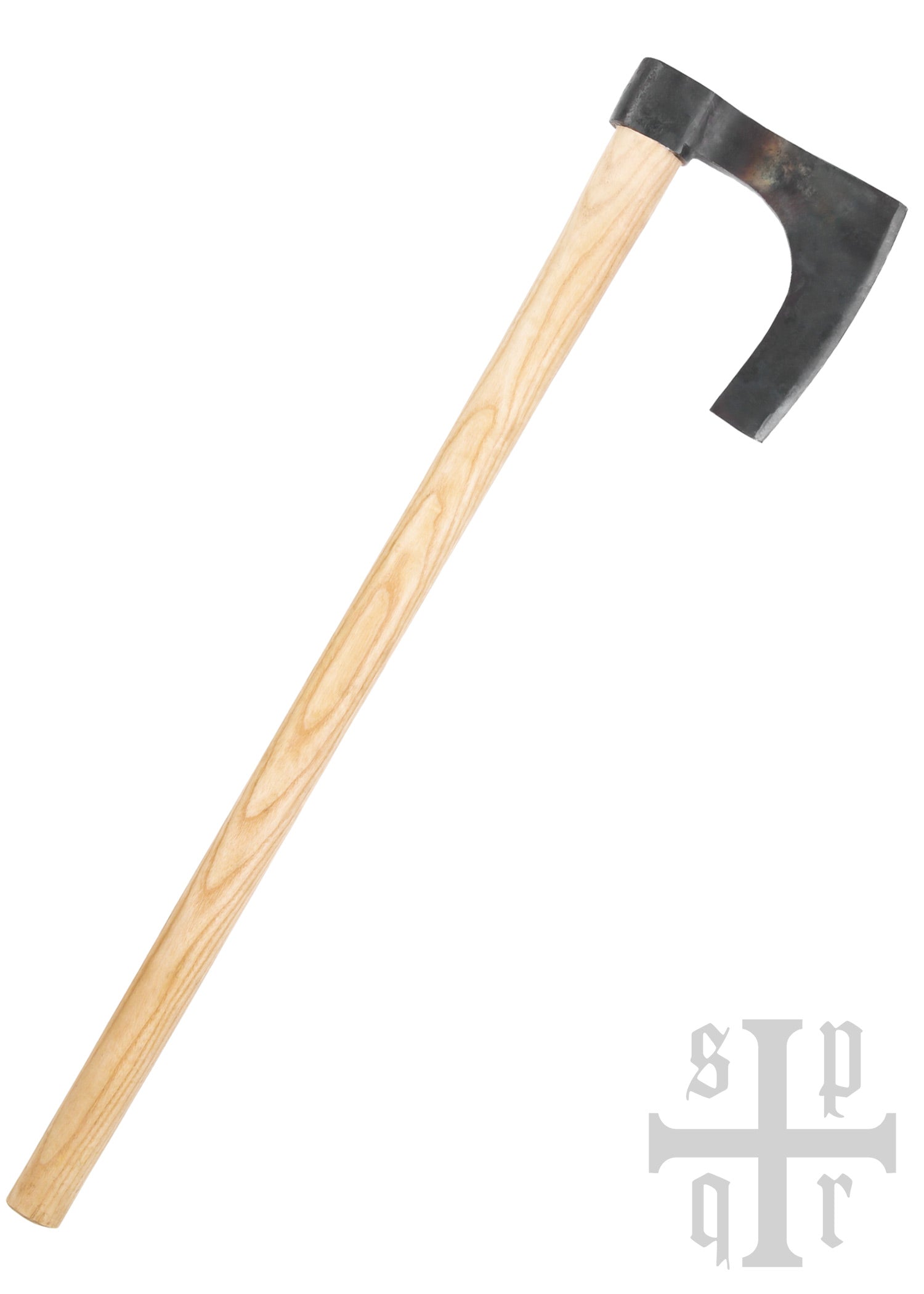 The distinctive blade of the axe featured here is mounted on an ash wood handle. It is hand-forged from carbon steel, has a blunt edge, and was deliberately left unpolished. The black tinder coating gives the Viking axe a rustic, authentic character.