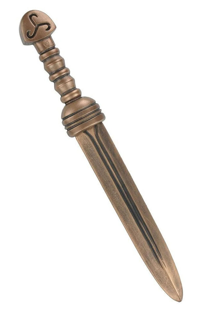 Description The Perseus dagger by Calimacil offers a new take on Bronze Age weaponry. It features a bronze-toned blade and handle with an antiqued finish, enhancing its antique appearance. The handle is designed for a firm grip and to prevent slipping. The pommel, decorated with a simple Bronze Age triskele, effectively balances the weapon. Made entirely from Calimacil's exclusive foam, this dagger is both safe and extremely durable.