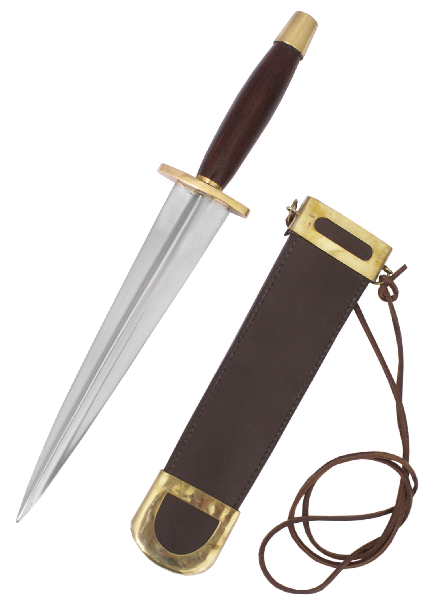 Our model has an unsharpened carbon steel blade and a wooden handle. The guard and pommel are made of brass. A matching leather sheath with brass fittings is included.