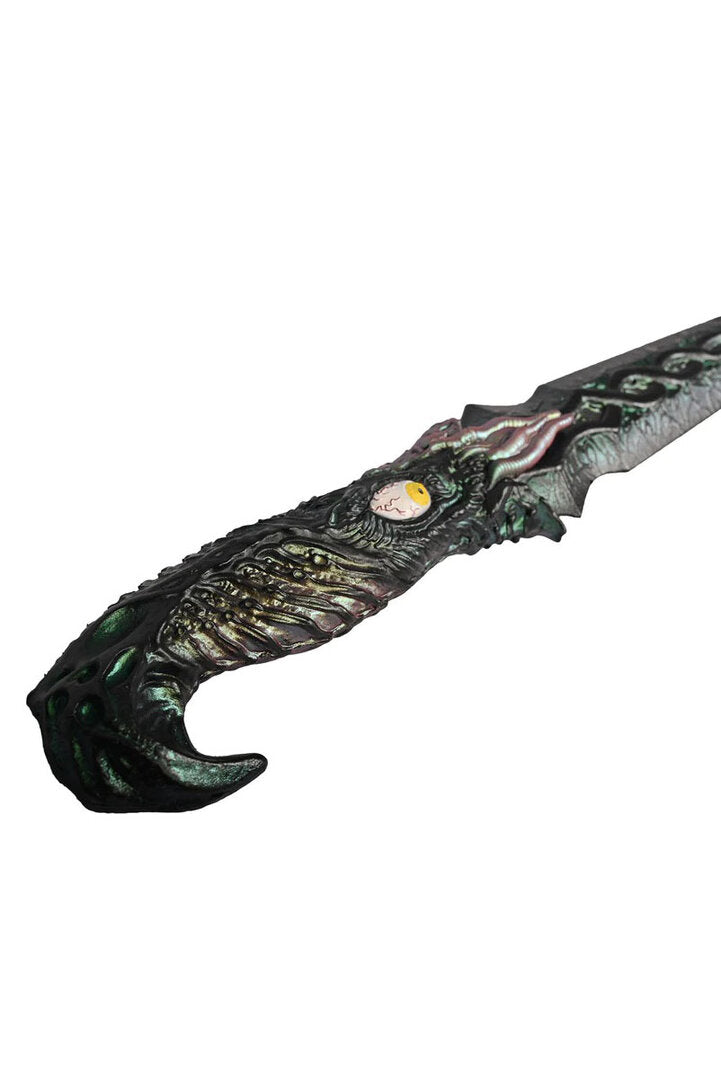 DescriptionCalimacil’s name Sakreiegt is derived from the Middle English terms ‘sakred’ (meaning sacrifice), ‘eie’ (eye), and ‘rigt’ (true). The handle is ergonomically shaped for a comfortable grip and designed to resemble a creature with a ridged underside, eerie eyes, and a wide mouth from which extends a blade adorned with coiling tendrils. This piece is notable for being the first to feature Calimacil’s ColorShift paint, adding an eerie glow to the weapon that appears almost alive. Drawing inspiration from cosmic horror mythology and ancient legendary creatures, this dagger is a true representation of the supernatural.