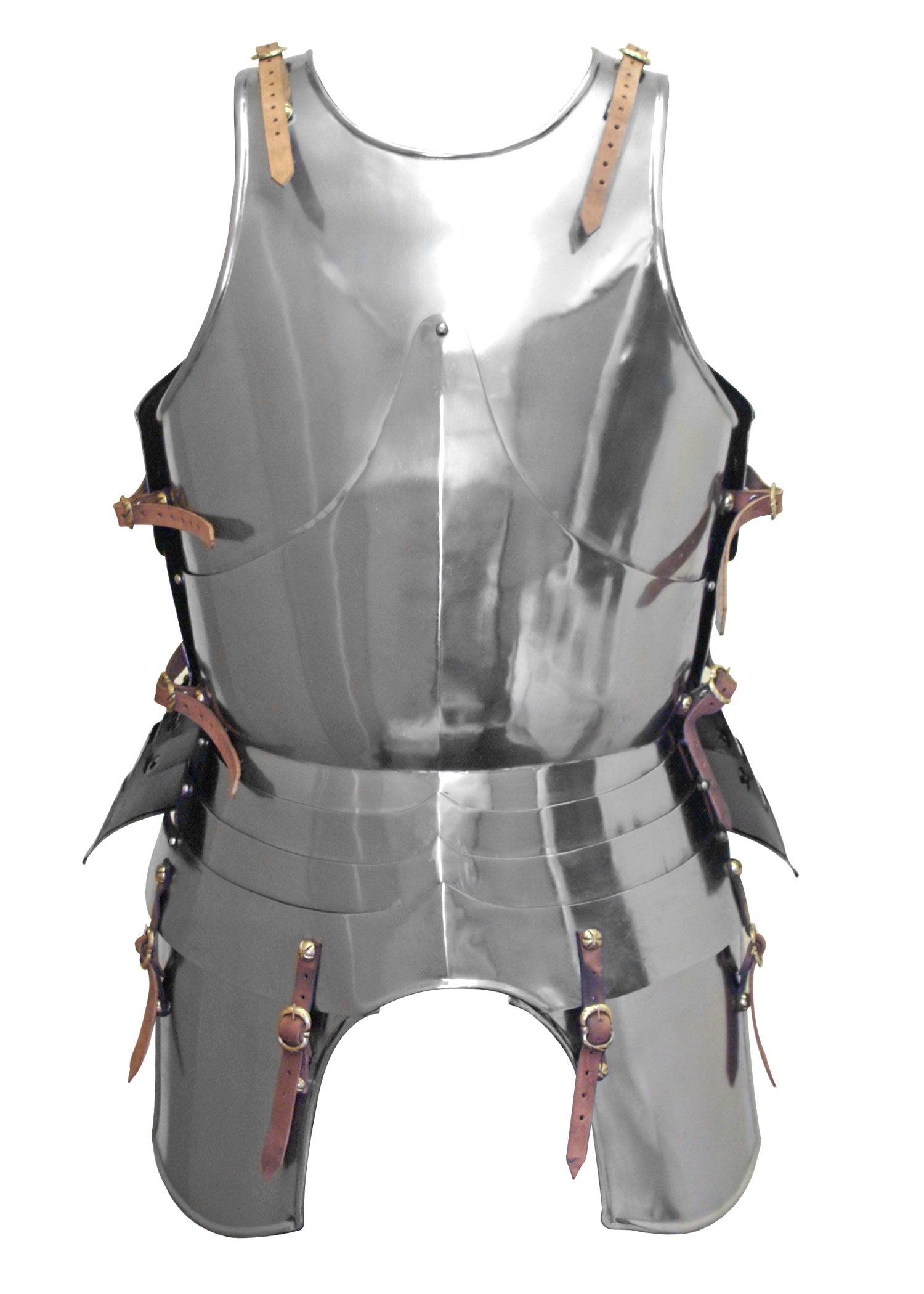 Esta armadura de placas italiana, inspirada en modelos de mediados del siglo XV, es una auténtica joya para recreadores, coleccionistas y amantes de la historia medieval. Está compuesta por peto, espaldar y cubrepiernas, unidos mediante correas de cuero con hebillas de latón, lo que permite un ajuste individualizado al cuerpo.