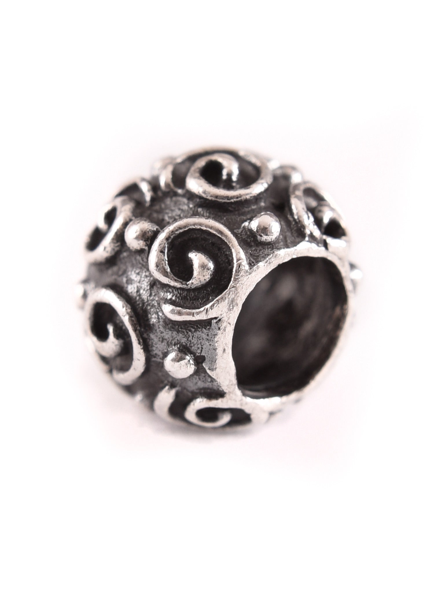Delicada y filigrana perla de joyería hecha de plata con el típico patrón de espiral.