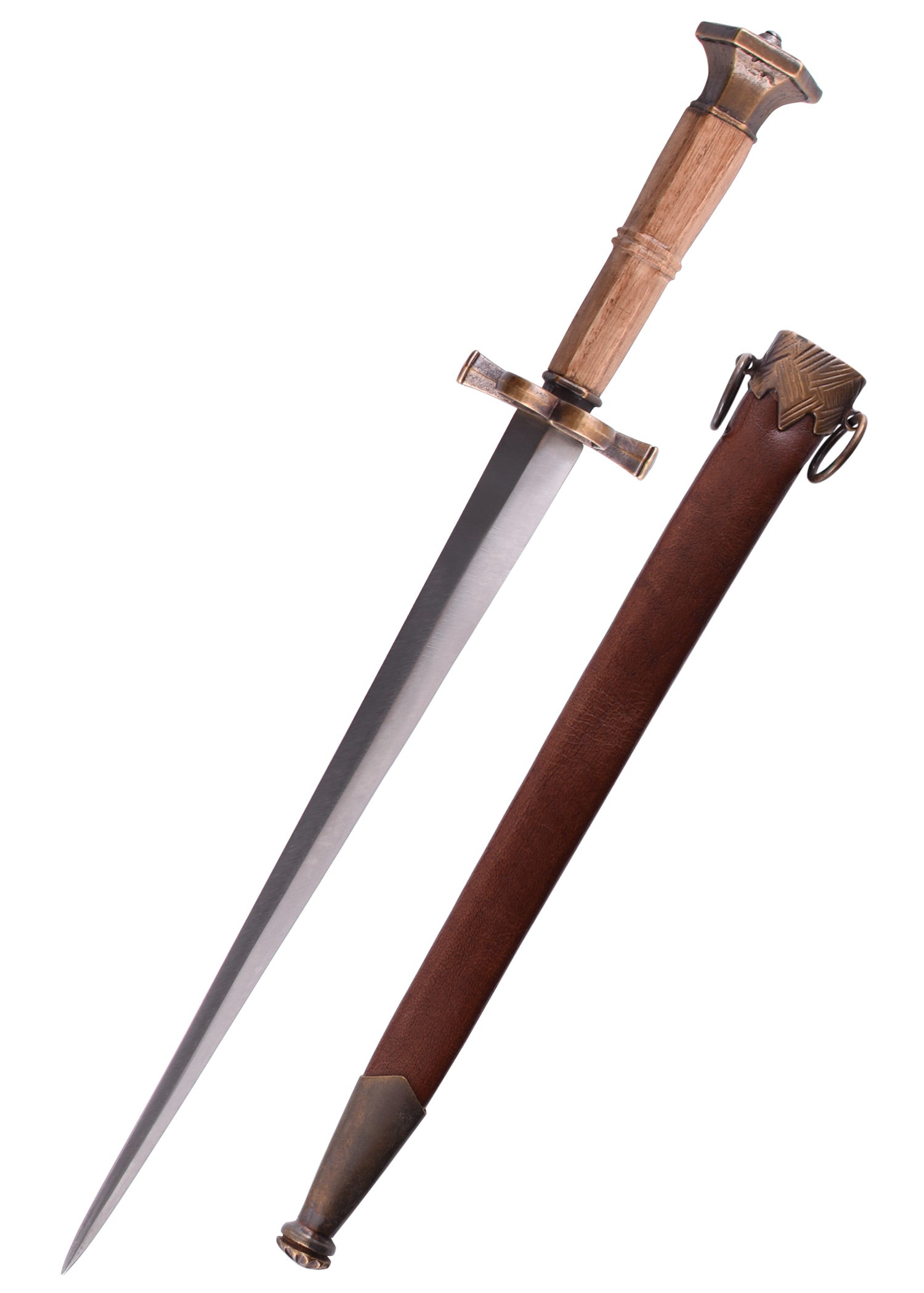 La hermosa arma punzante que ofrecemos aquí está basada en una pieza original de principios del siglo xvi (ca. 1510-1540), que ahora se encuentra en la colección del museo metropolitano de arte (the met). ubicado en la ciudad de nueva york. la hoja está hecha de acero para muelles en45, tiene una sección transversal en forma de diamante y se estrecha hasta formar una punta afilada. los bordes cortantes no están afilados y la espiga está atornillada al extremo del mango (tuerca roscada). la guarda y el pomo, ambos artísticamente elaborados, están hechos de latón con un acabado antiguo y la sección del mango está tallada en madera. la guarda, ligeramente ensanchada en ambos lados hacia el final, está equipada con un anillo lateral en forma de b y el pomo hexagonal se estrecha hacia arriba y remata con una tapa plana bellamente decorada.