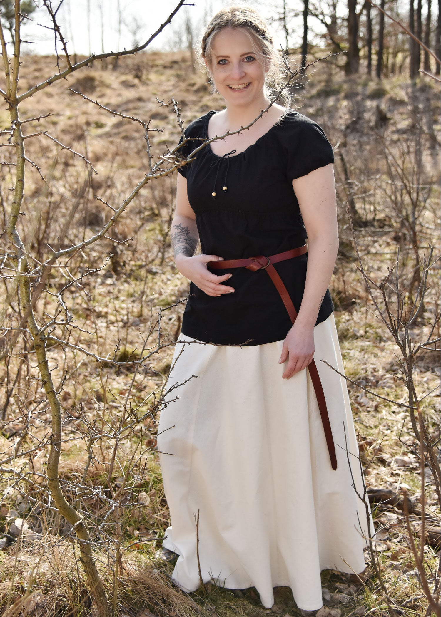 Debido a su corte amplio y largo generoso, esta falda cae muy elegante. los dos bolsillos cosidos en el interior son prácticos y subrayan el bonito ajuste de esta falda medieval.