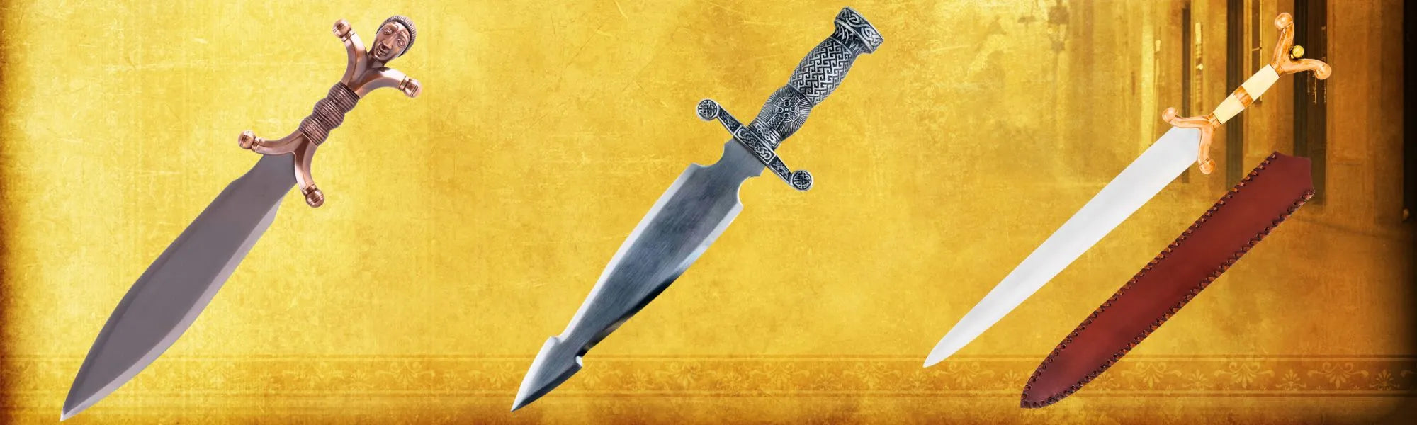 Os celtas ostentavam punhais de lâmina larga com cabos decorados com motivos espirais, trísceles e símbolos rúnicos. Eram armas de combate corpo a corpo, mas também instrumentos rituais que refletiam a estreita relação entre a guerra e a espiritualidade druídica.